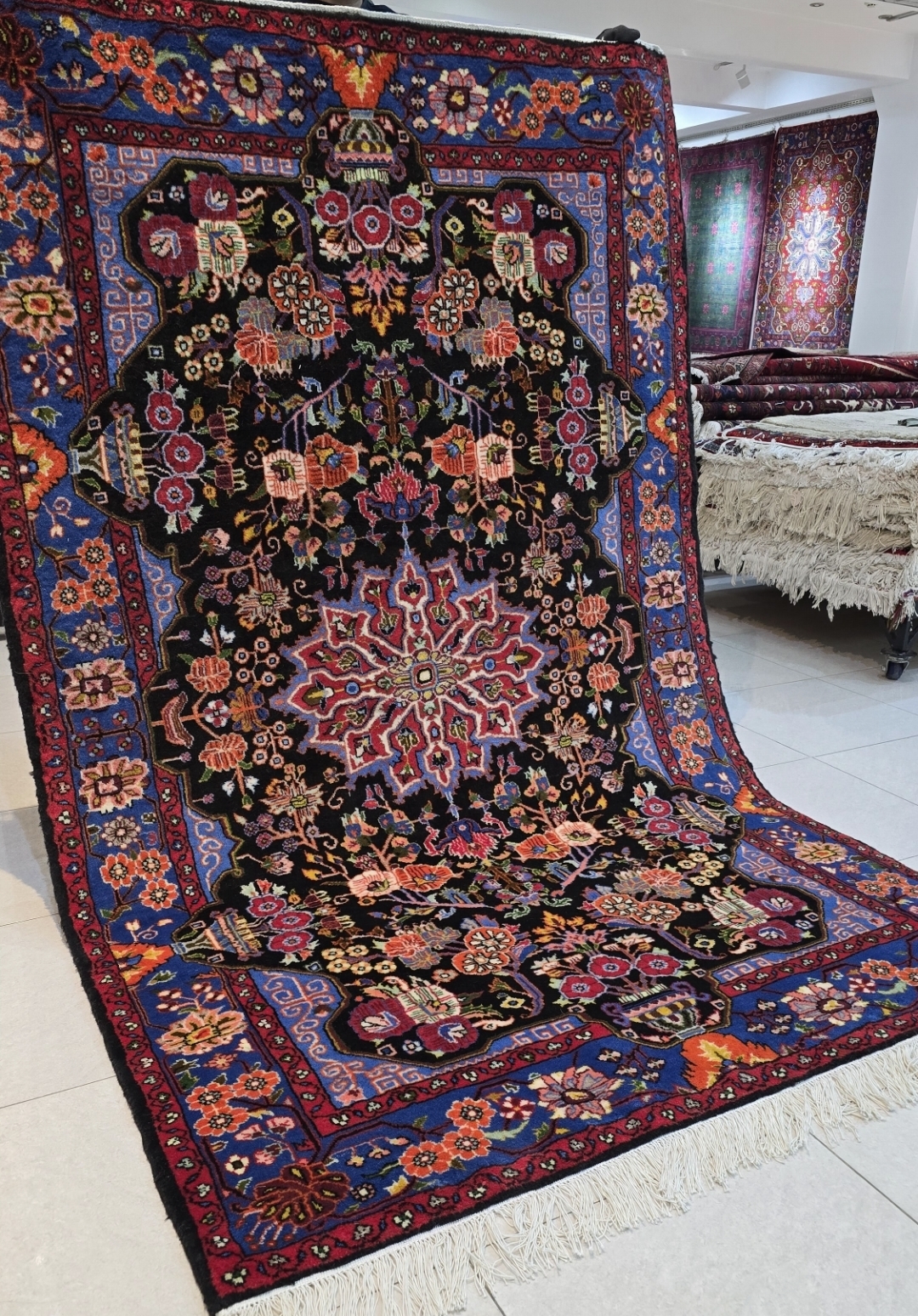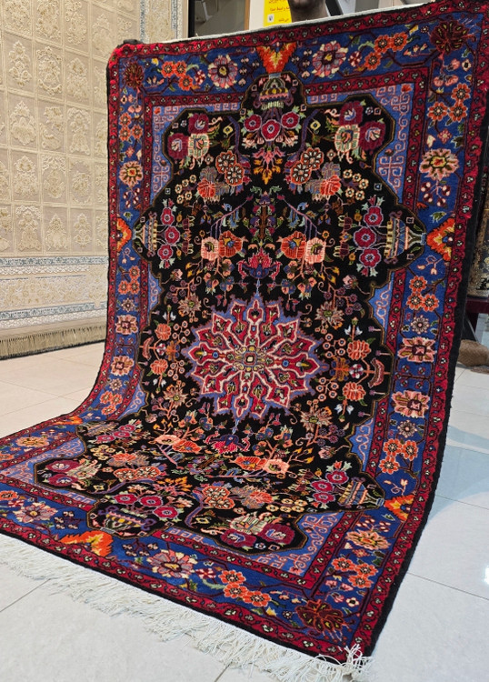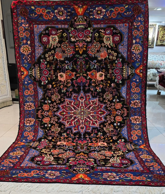 فرش دستباف قالیچه چهار متری نقشه کله گلی عشوند بافت نهاوند زمینه مشکی